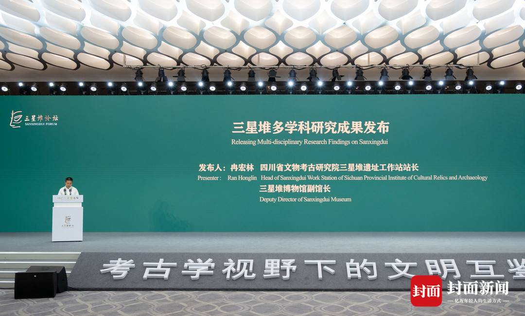 值得一提的是,开幕式上,四川省文物考古研究院三星堆遗址工作站站长、三星堆博物馆副馆长冉宏林在现场公布了两项研究成果。第一项为三星堆祭祀坑精准的埋藏年代,即三号、四号、六号、八号祭祀坑埋藏年代有95.4%的概率处于公元前1201年至公元前1012年,相当于商代晚期。根据一、二、三、四、七、八号坑中发现可拼对的同一器物残片,表明埋藏年代相同。