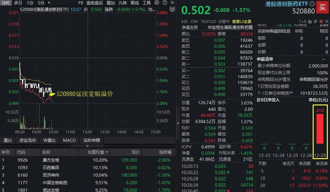 12月30日,港股通创新药板块继续调整,港股通创新药ETF(520880)续跌逾1.5%,场内价格创7月11日以来新低!场内延续宽幅,显示买盘资金仍较强势凡资配,昨日已有410万元资金逢跌进场。